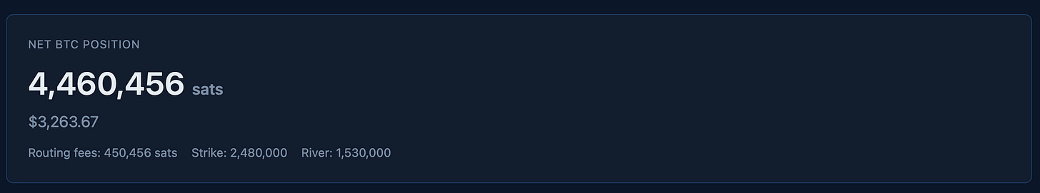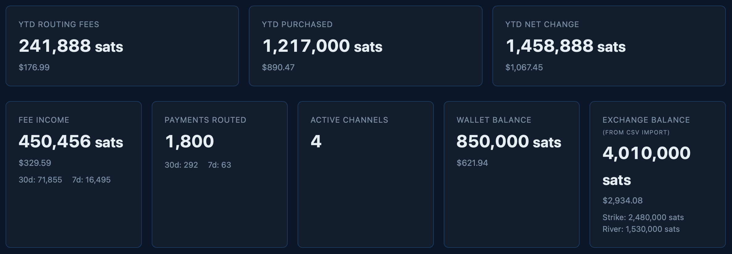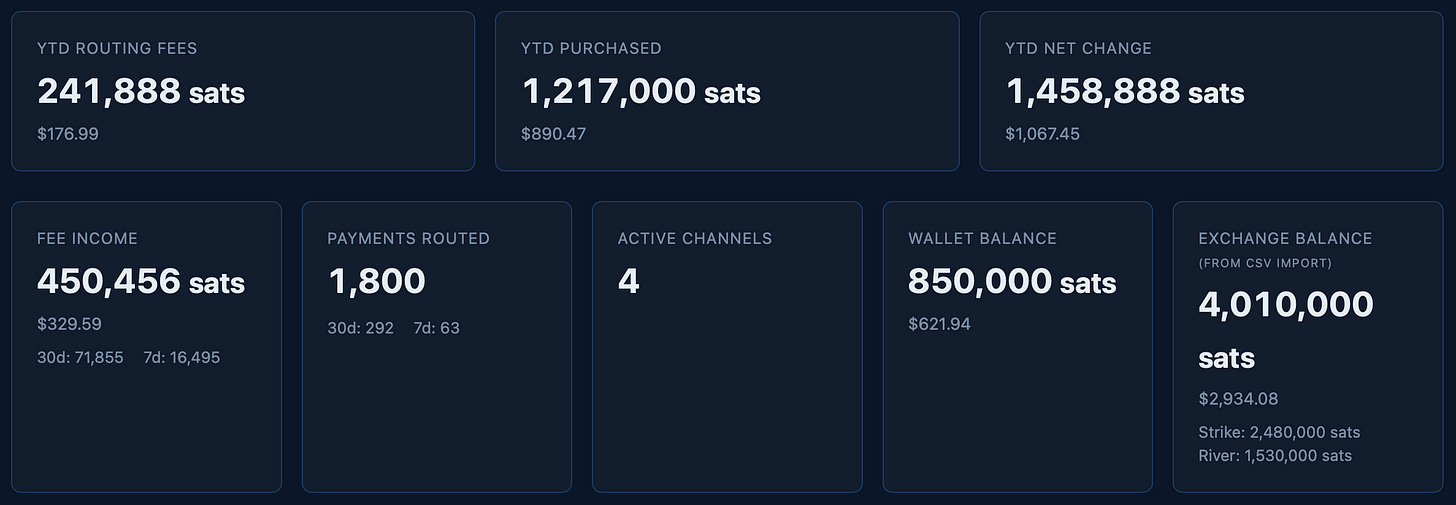 This is the strip I check every morning. Three numbers: what my node earned in routing fees this year, what I purchased through exchanges this year, and my net position change. One line that tells me whether my stack is growing and where the growth is coming from.
