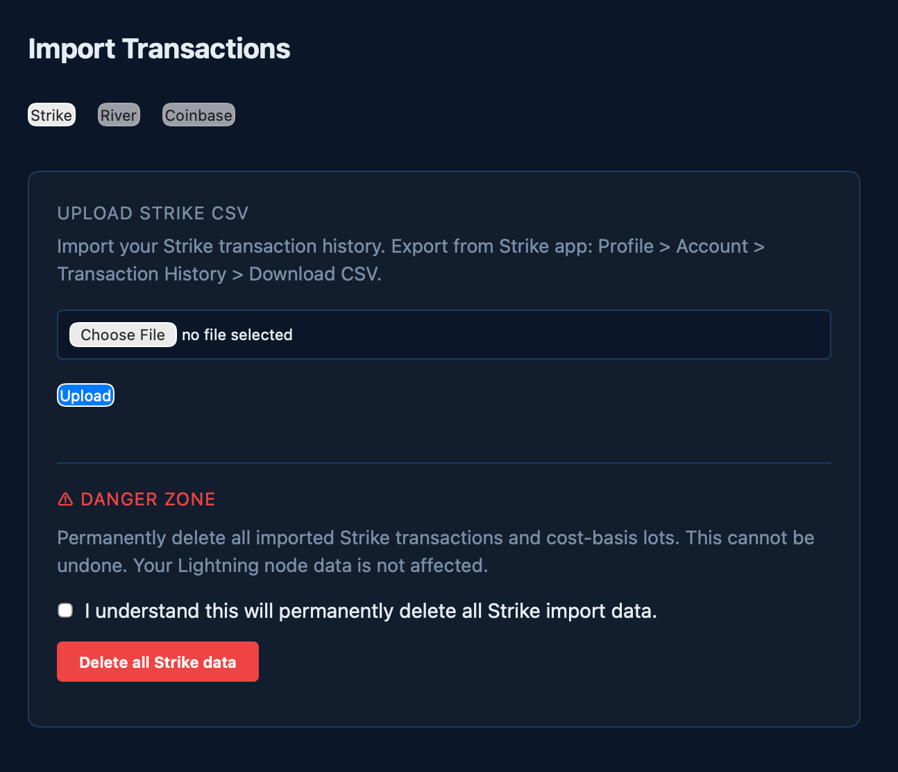 This is the unlock. Three tabs — Strike, River, Coinbase. Drop a CSV, hit upload. Satsbook parses it, deduplicates by content hash so you can re-upload safely, and folds those transactions into your unified ledger. Each vendor has a danger zone at the bottom if you need to clear and re-import. The whole cycle takes about thirty seconds.
