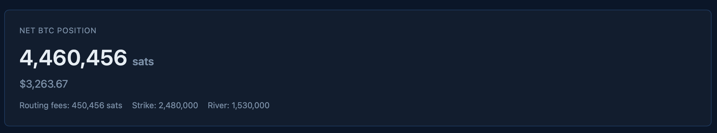 I’ve been running a Lightning node on Umbrel for five years. I DCA through Strike and River. I hold a small position on Coinbase from before I went self-custody. My node routes payments and earns fees. Each of those pieces has its own interface, its own export format, its own version of the truth. None of them talk to each other. None of them give me the one number I actually want: my total Bitcoin position across everything, and what it cost me to build it.