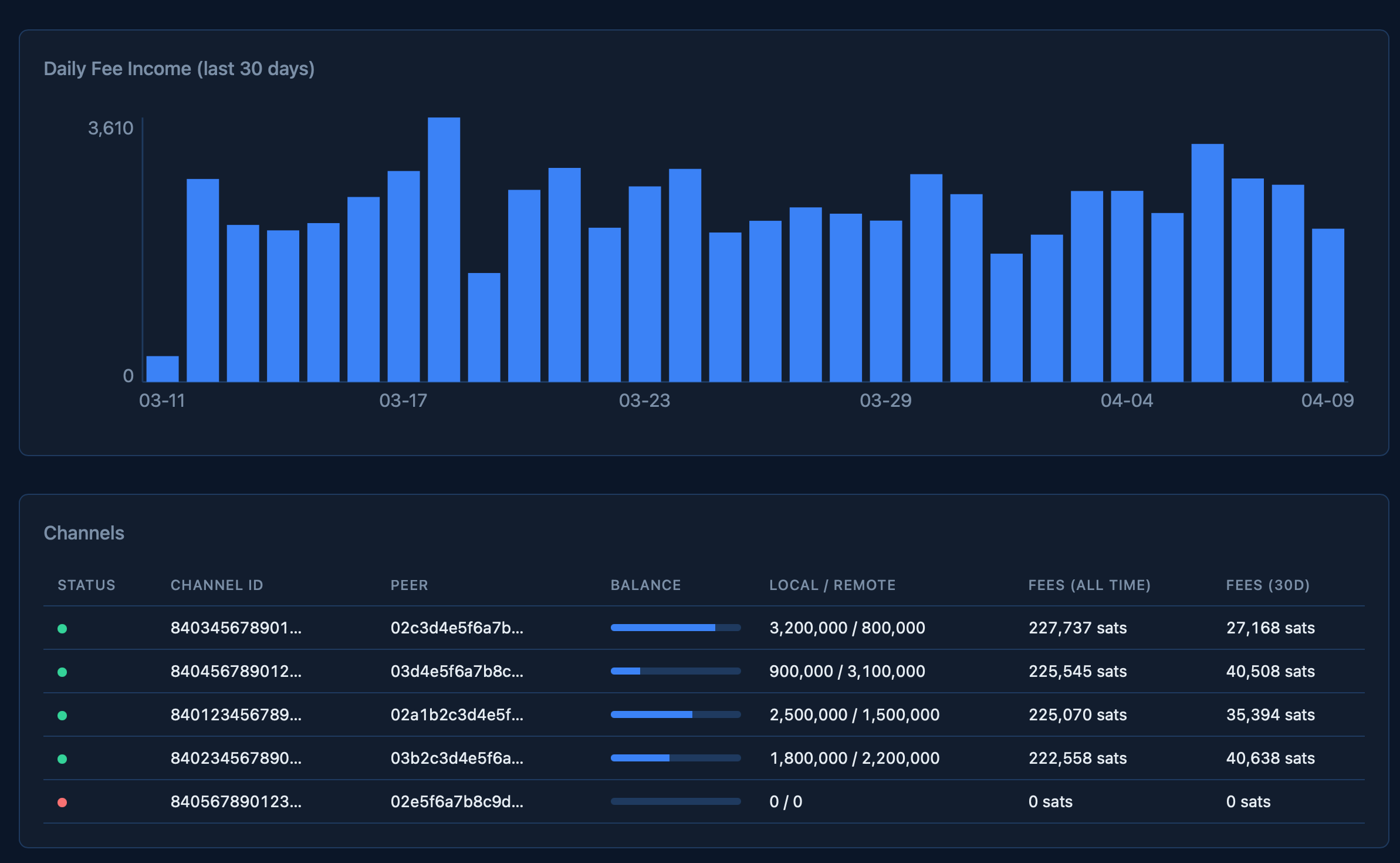 This is for the routing nerds. Daily fee income charted over time, with a per-channel breakdown underneath. You can finally see which channels are earning their keep and which ones are just sitting there consuming capital.